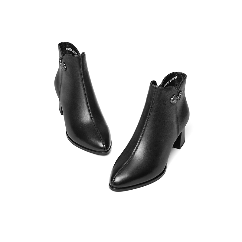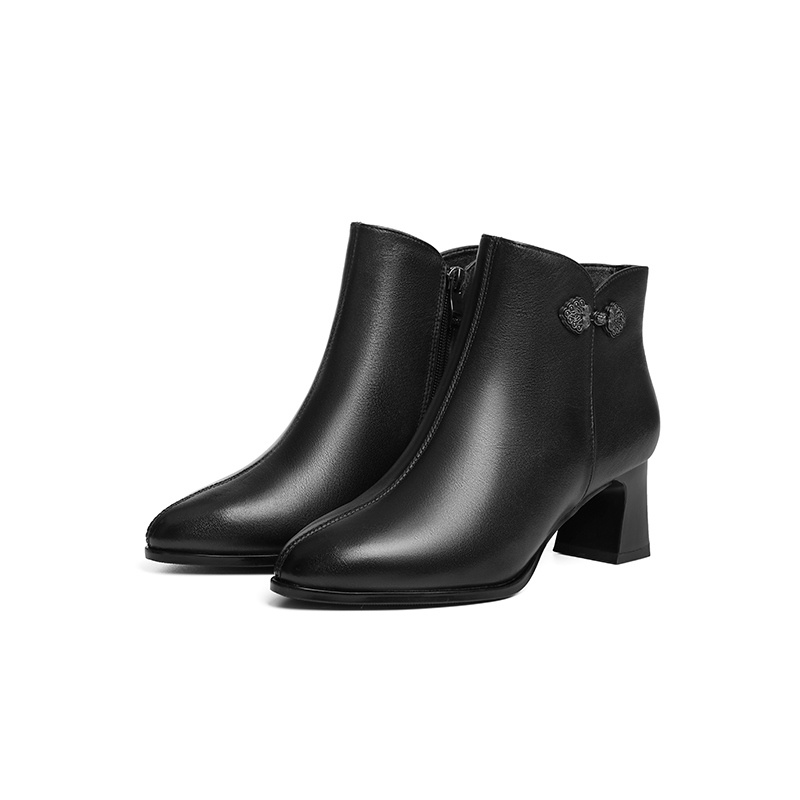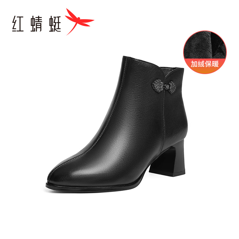 百搭中年女士皮鞋 红蜻蜓高跟短靴女妈妈靴子秋冬新款 加绒女靴棉鞋