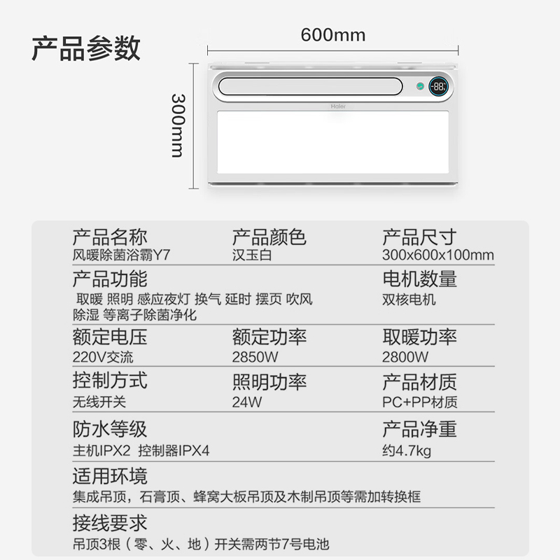 海尔浴霸风暖卫生间排气照明一体集成吊顶除菌Y7 免费安装
