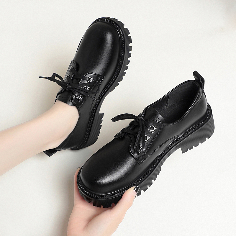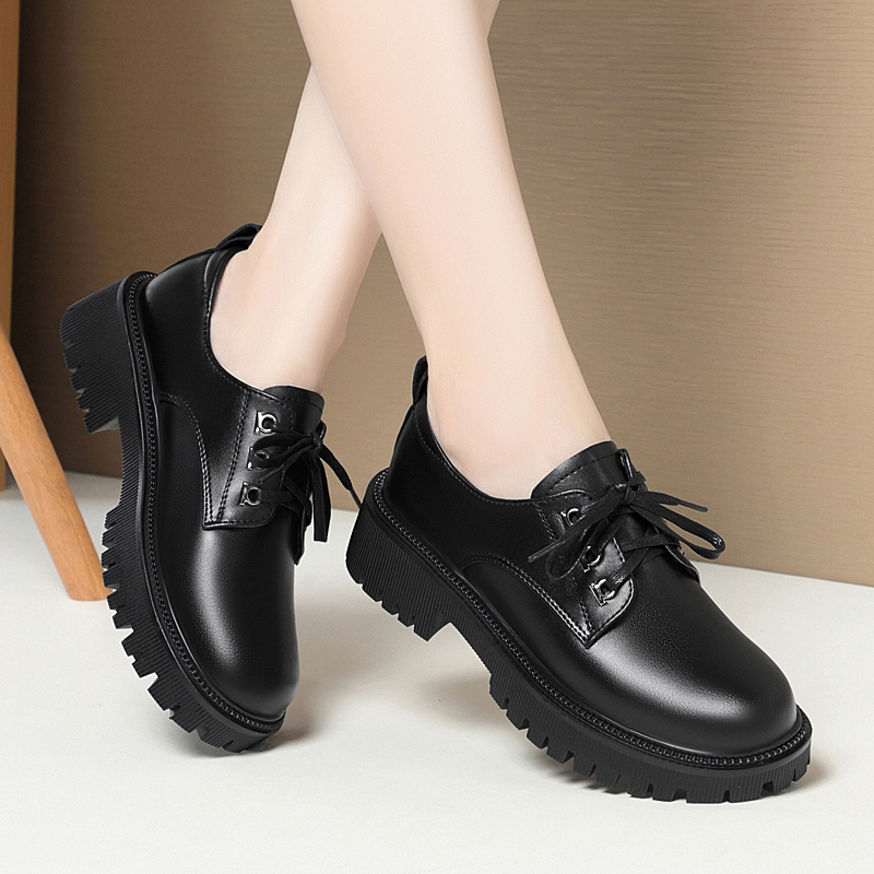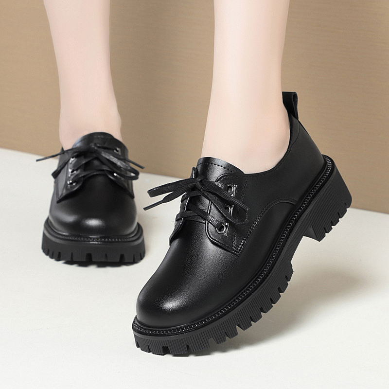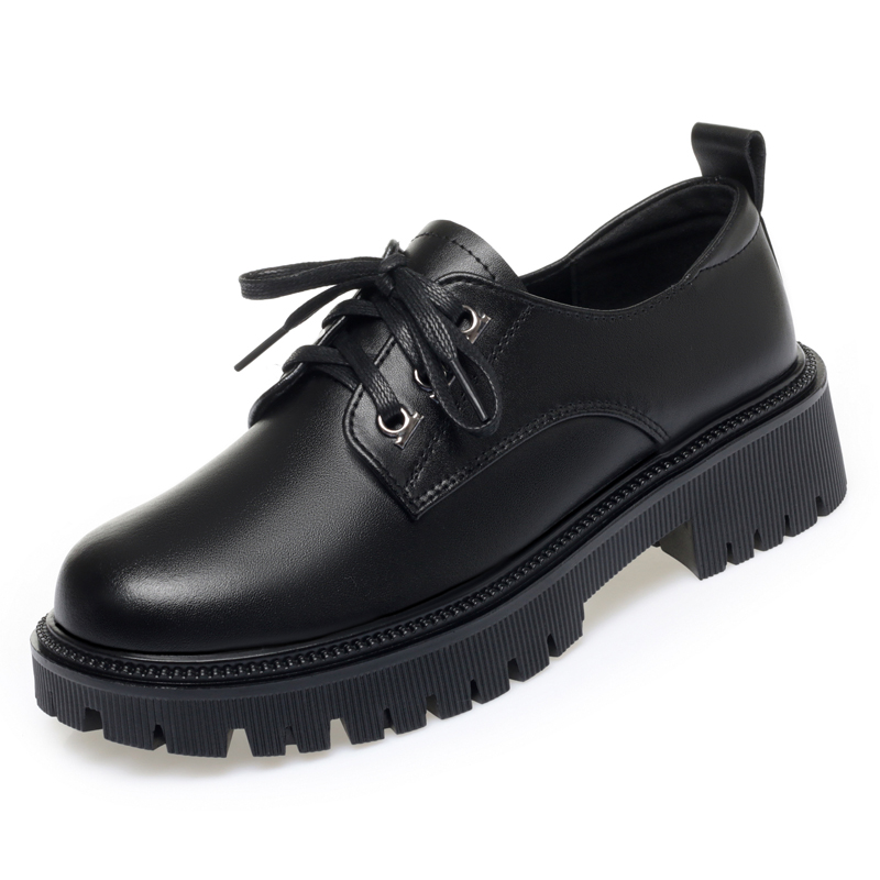 秋季 新款 小皮鞋 系带黑色厚底女士单鞋 真皮单鞋 大码 女英伦风乐福鞋