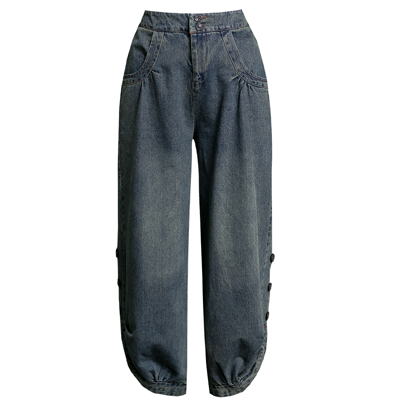 老爹裤 文艺气质显瘦长裤 女九分高腰休闲阔腿裤 复古做旧牛仔灯笼裤