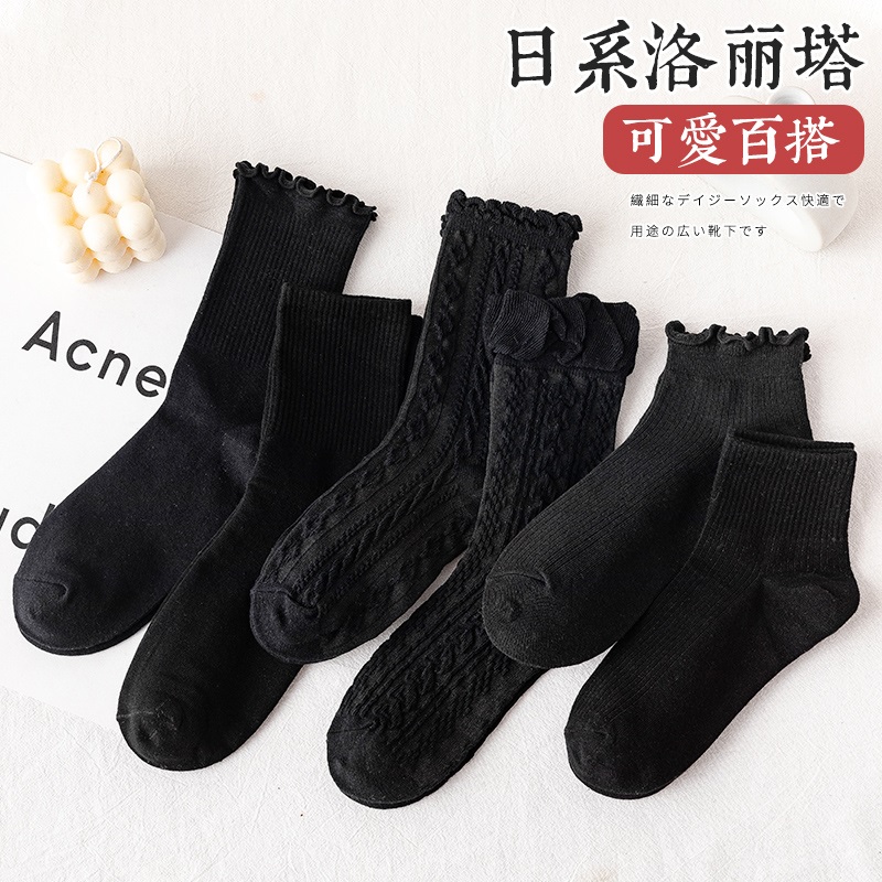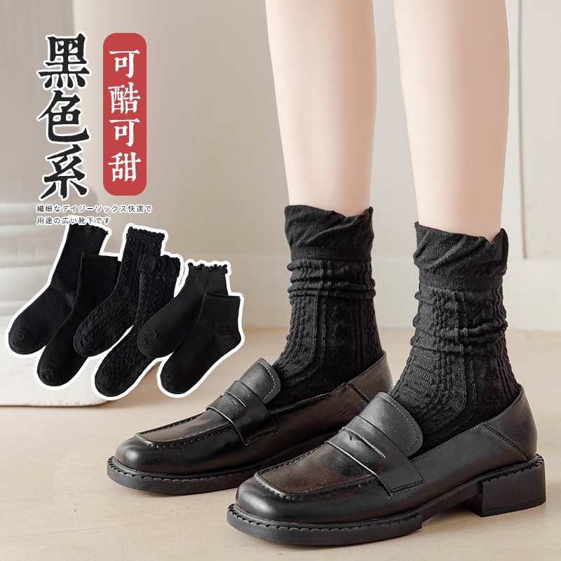 黑色花边可爱甜美ins风韩式 中筒堆堆袜子 潮流外穿搭配乐福小皮鞋