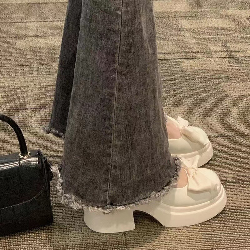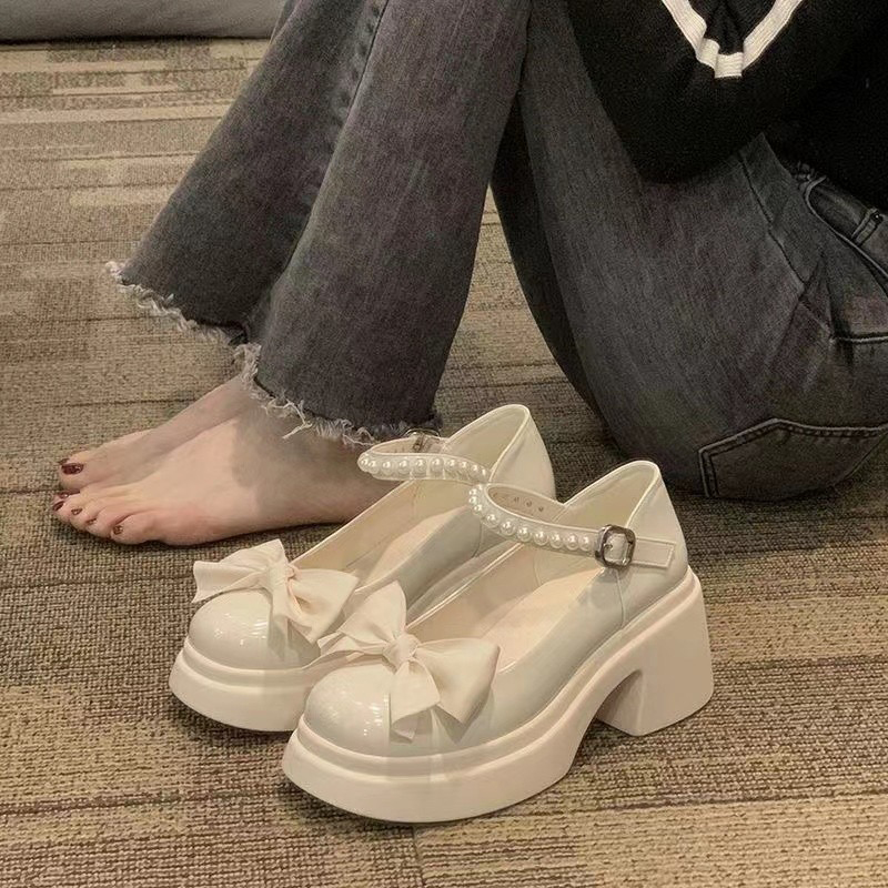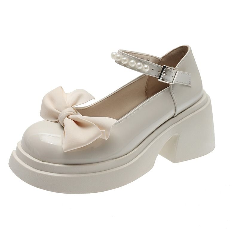 温柔高跟鞋 女厚底中跟增高蝴蝶结配裙子单鞋 玛丽珍小皮鞋 白色法式