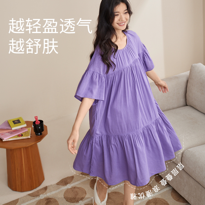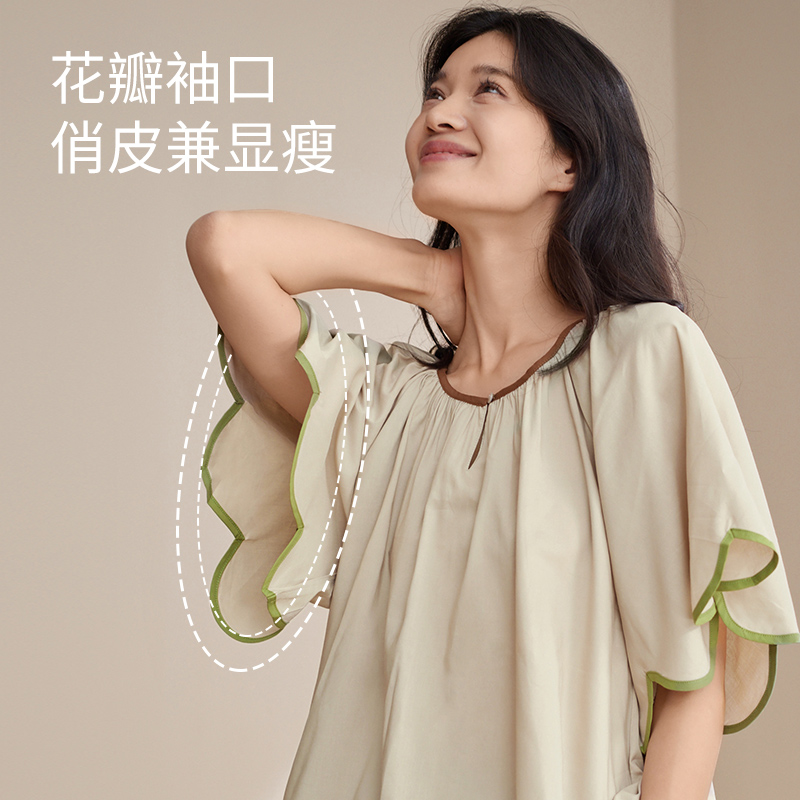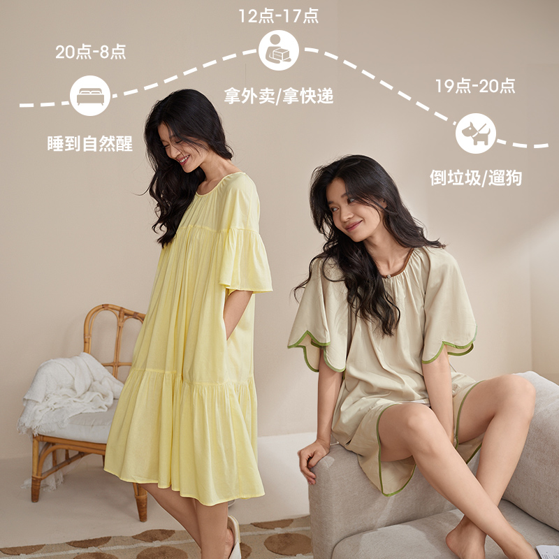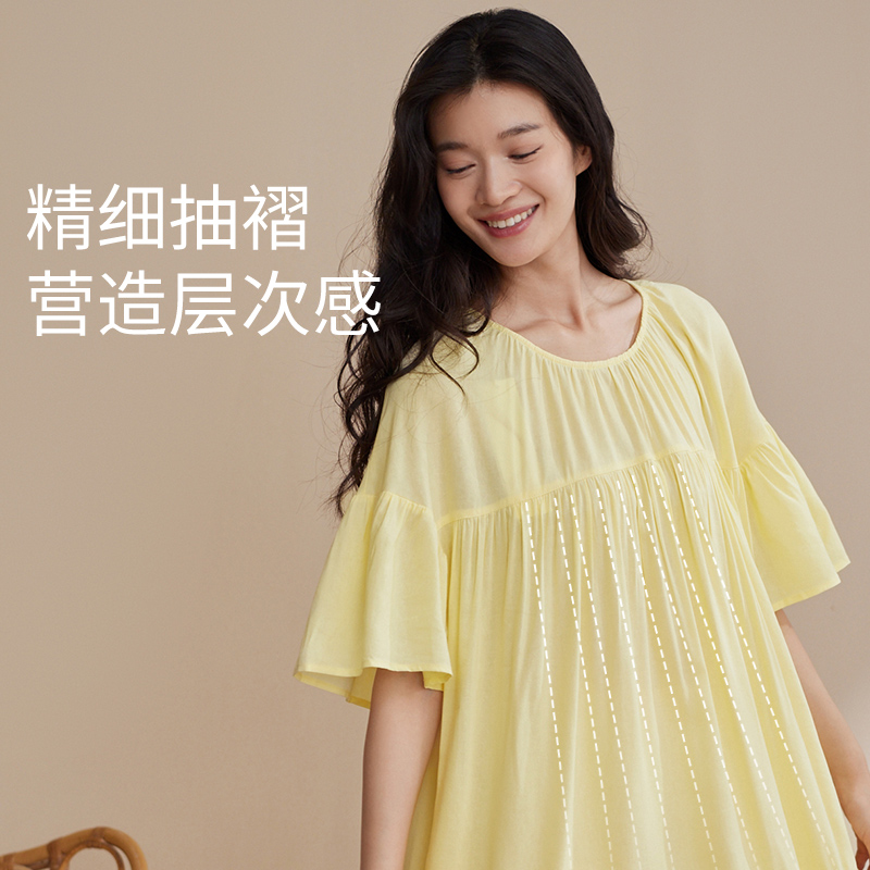秋鹿梭织棉质圆领短袖 甜美宽松家居服可爱小清新睡裙 睡衣女夏季