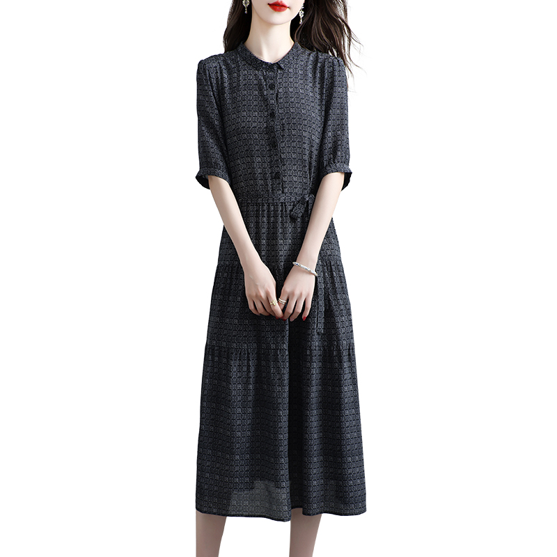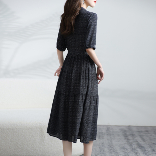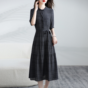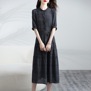 新款 真丝连衣裙女桑蚕丝收腰中老年妈妈复古显瘦通勤气质裙子夏季