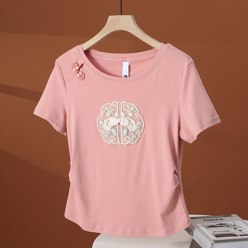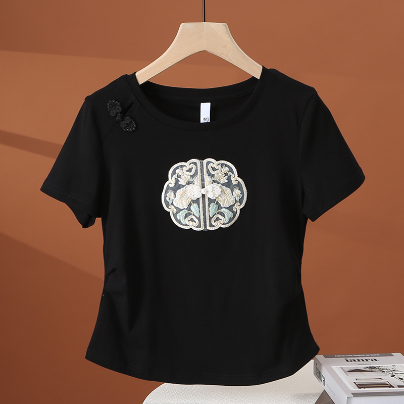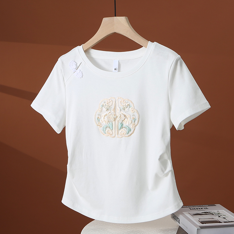 新中式 小个子短款 国风短袖 修身 收腰刺绣白上衣 t恤女2025新款 夏季