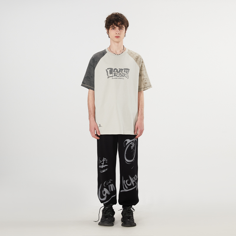 上衣 字母印花潮牌男宽松薄大码 LAMLICKA夏季 圆领插肩拼接撞色短袖