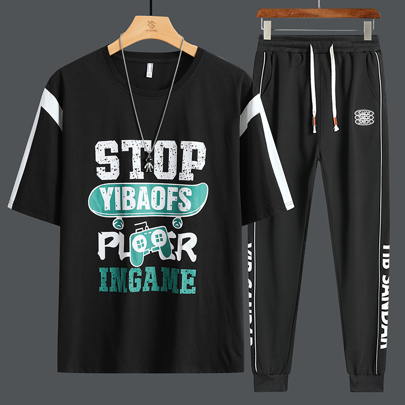 男青少年高中学生潮流帅气休闲男套装 宽松版 T恤长裤 拼色短袖 时尚