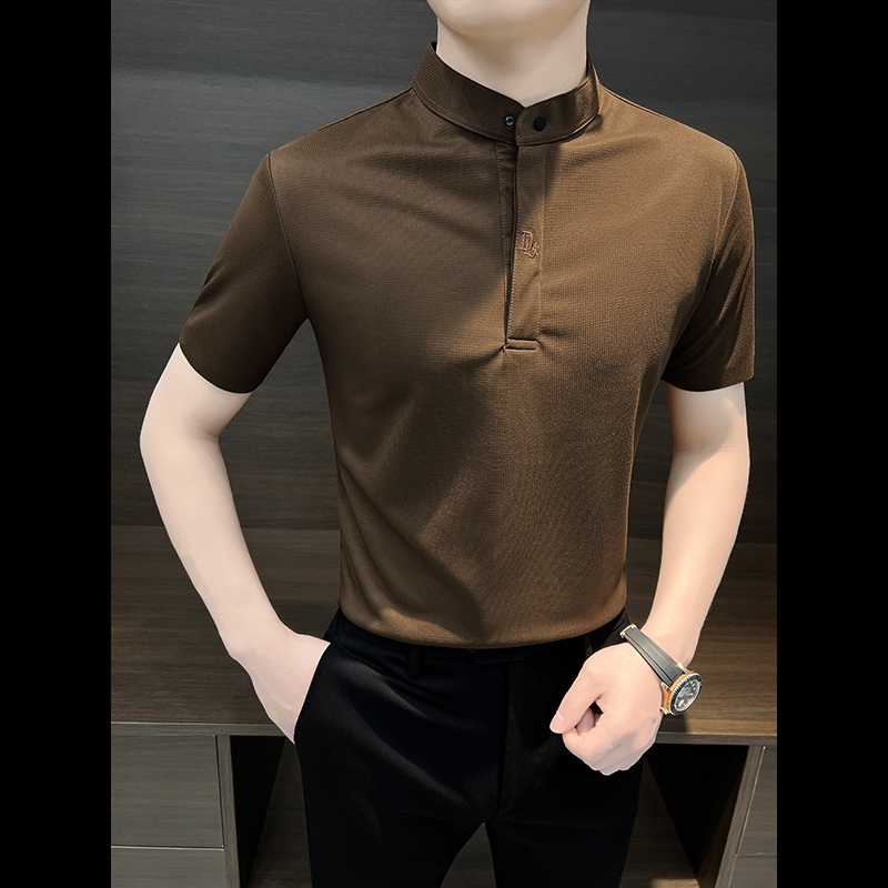 短袖 改良中山装 男夏季 男装 弹力无痕刺绣t恤 冰丝新中式 立领polo衫