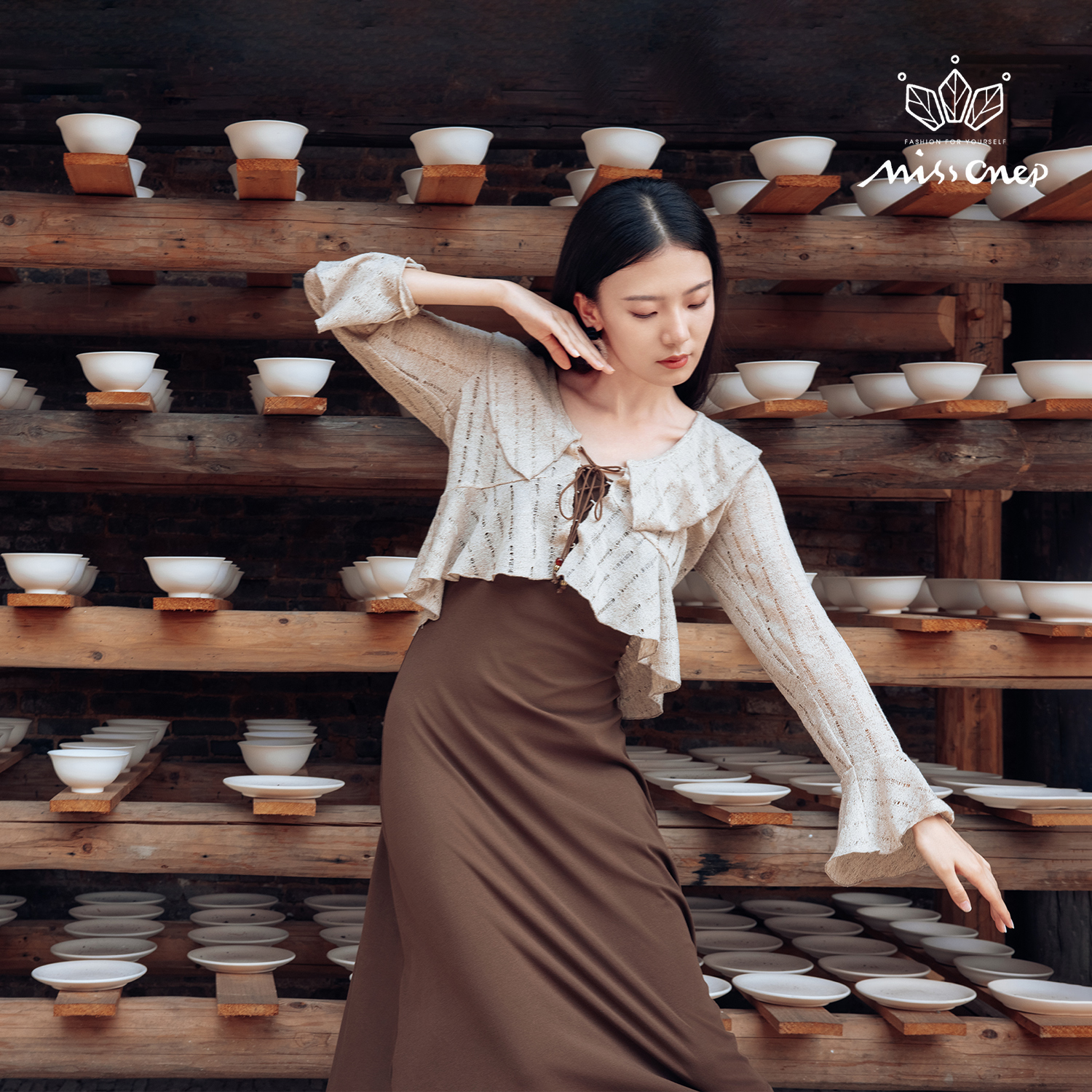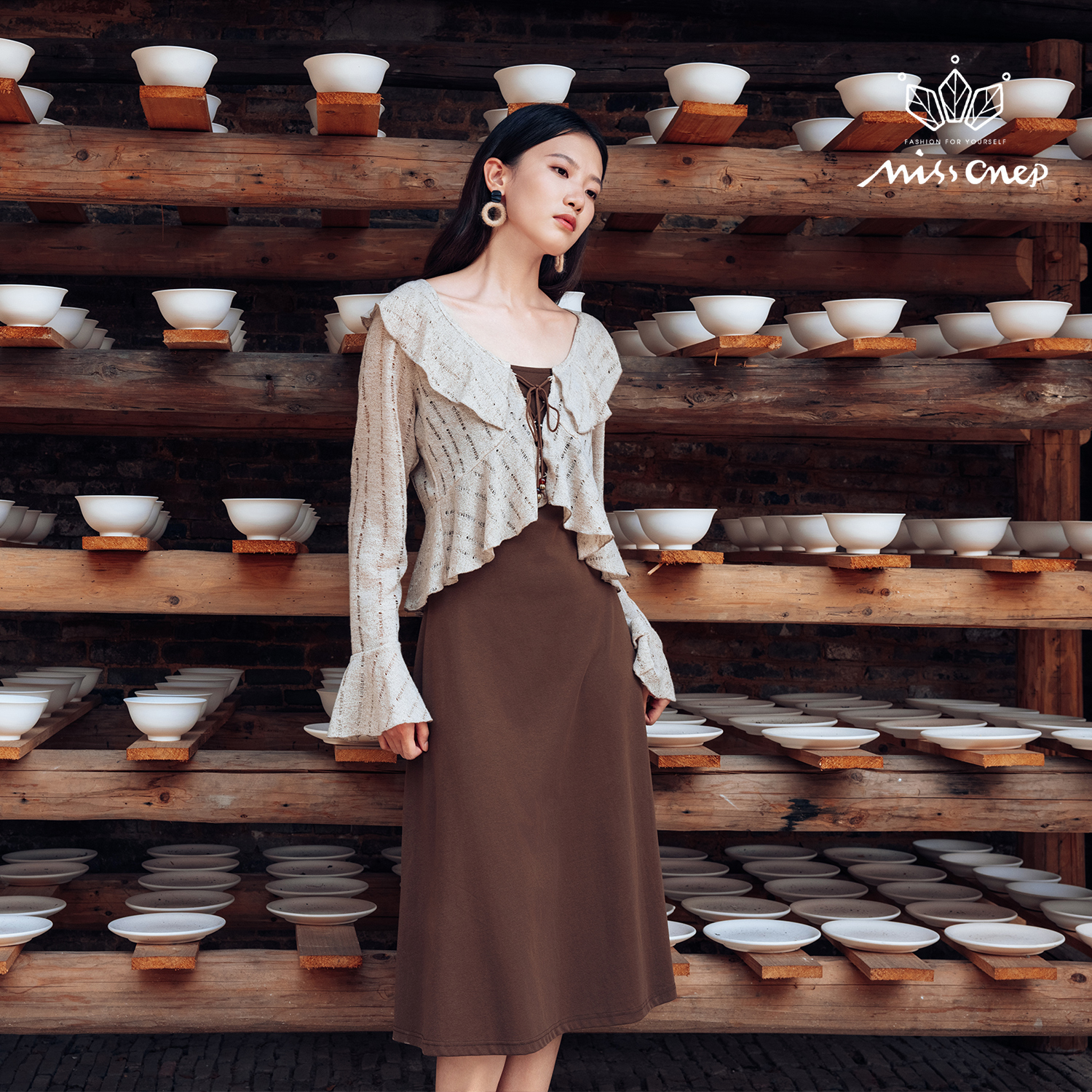 吊带裙早秋穿搭套装 Missonep满 修身 荷叶边设计绑带开衫 梧桐坠