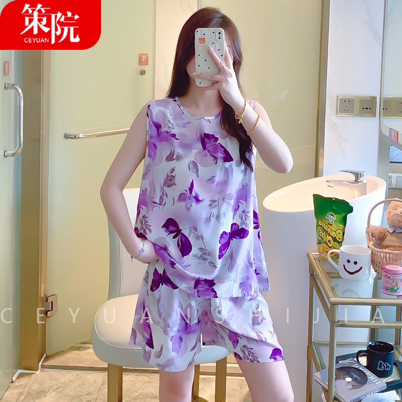 韩版 套装 加肥加大人造棉空调家居服绵绸 棉绸睡衣背心短裤 女士夏季