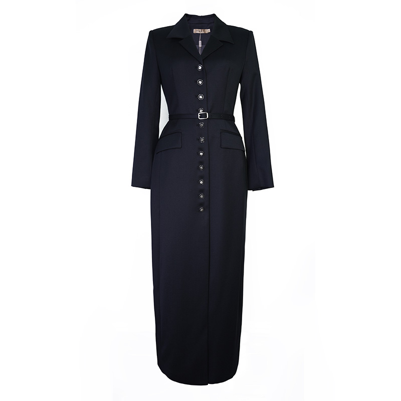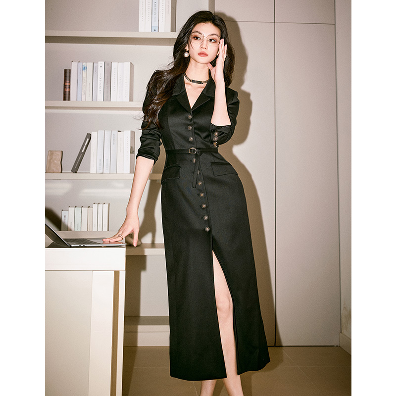 添香春季 黑色修身 新款 经典 排扣知性优雅风衣连衣裙 时尚 颈袖