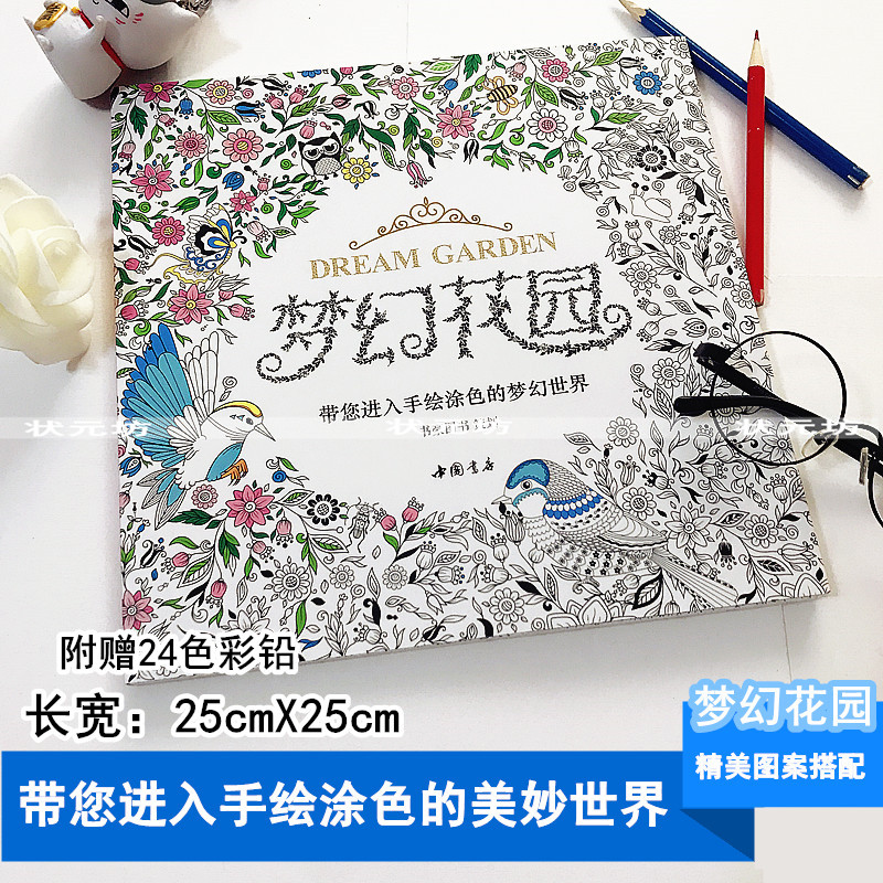 儿童版 正版 梦幻花园 填色书成人手绘减压涂色画册大人解压涂鸦画集趣味涂色画画本魔法森林创意黑白图案填色书籍 赠24色彩铅