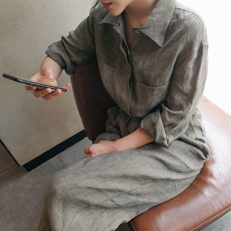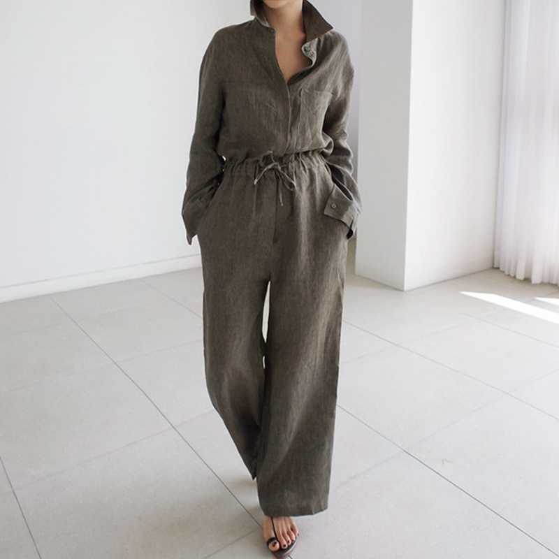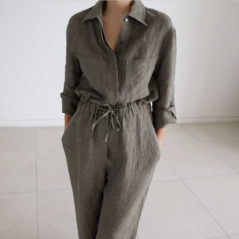 连体裤 长袖 女宽松大码 九分阔腿裤 新款 抽绳收腰亚麻休闲裤 棉麻衬衫