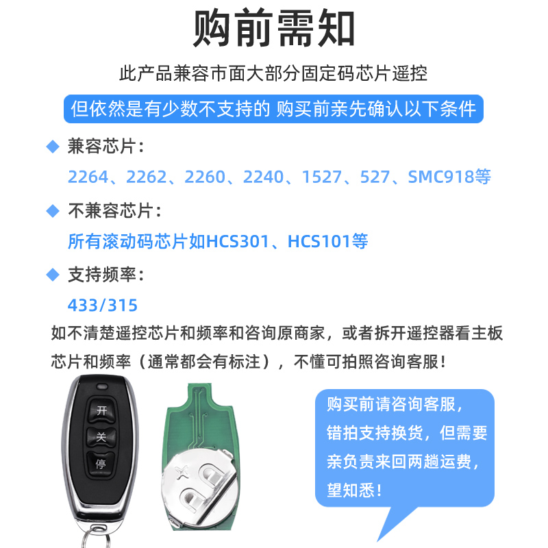 433 315对拷贝电动卷帘门卷闸门伸缩门钥匙车库门遥控器