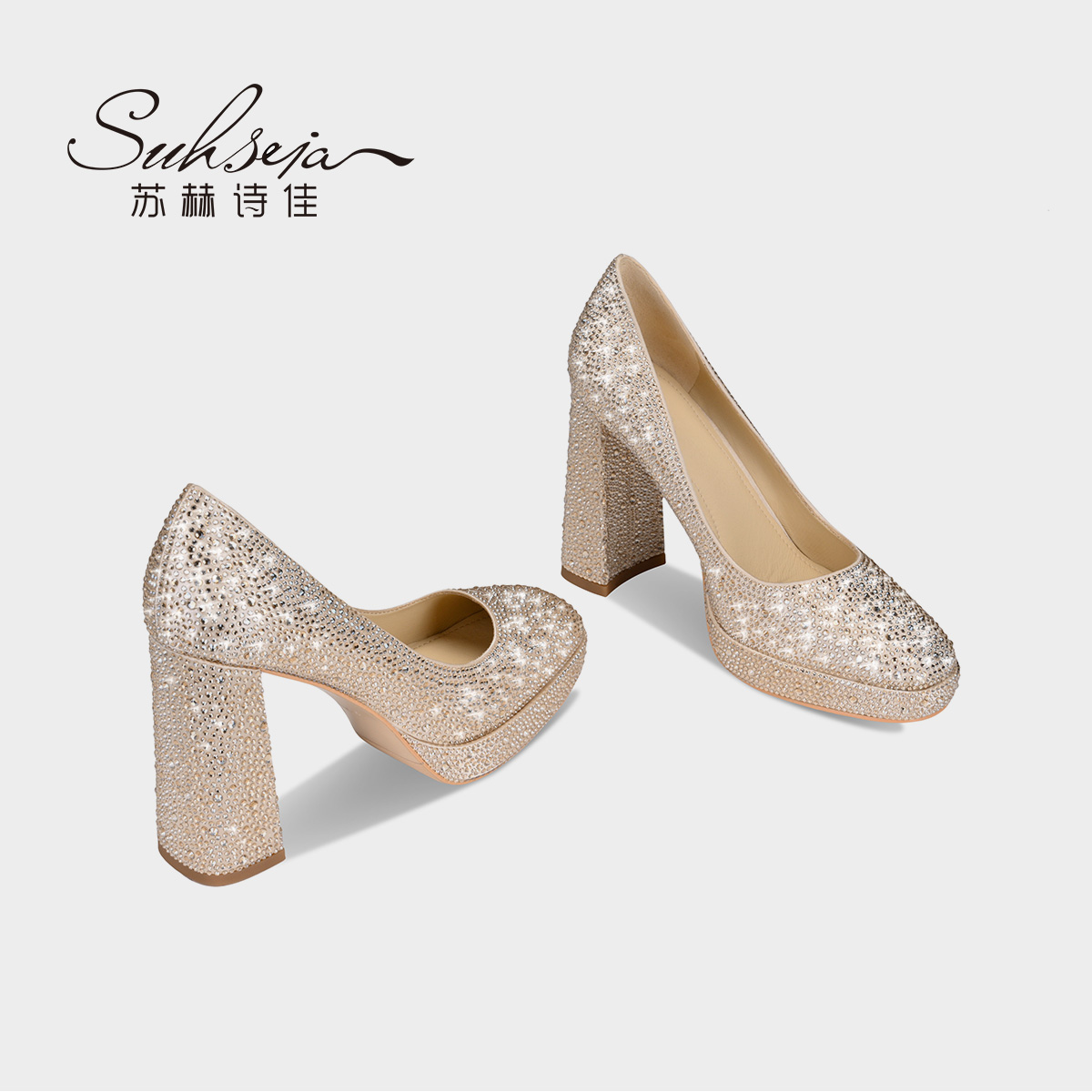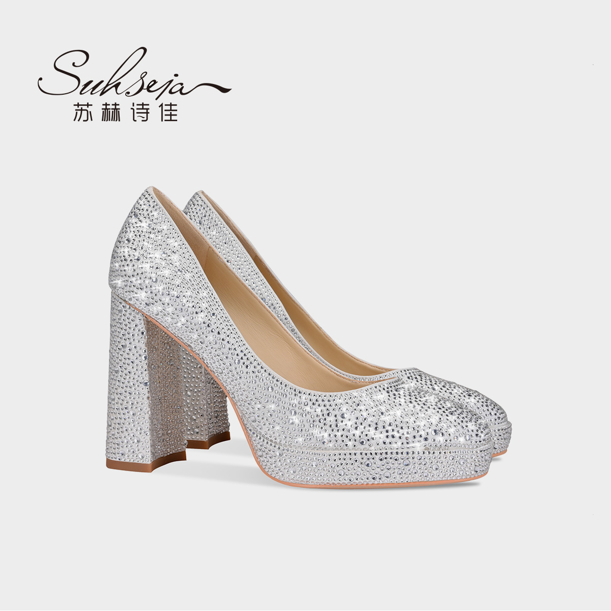 走秀模特水钻少女圆头粗跟厚底单鞋 银色女士高跟鞋 2025年春秋新款