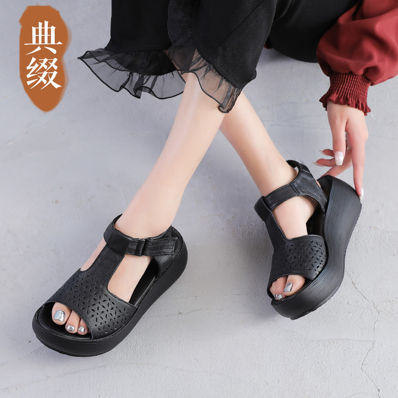 增高百搭软底鱼嘴皮鞋 典缀真皮凉鞋 松糕厚底罗马鞋 新款 子 女夏季