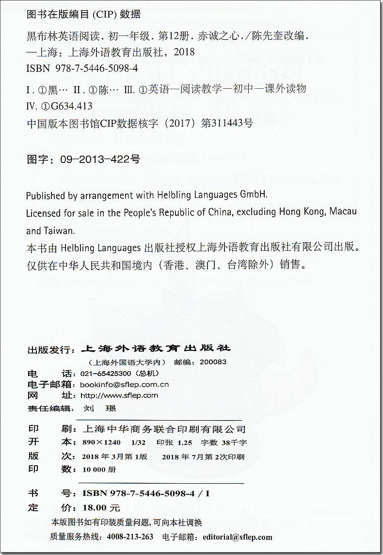 上海外语教育出版 初一 社 初中生英文学习分级训练课外读物 第1辑单本 赤诚之心 七年级文学名著小说故事书籍 黑布林英语阅读系列