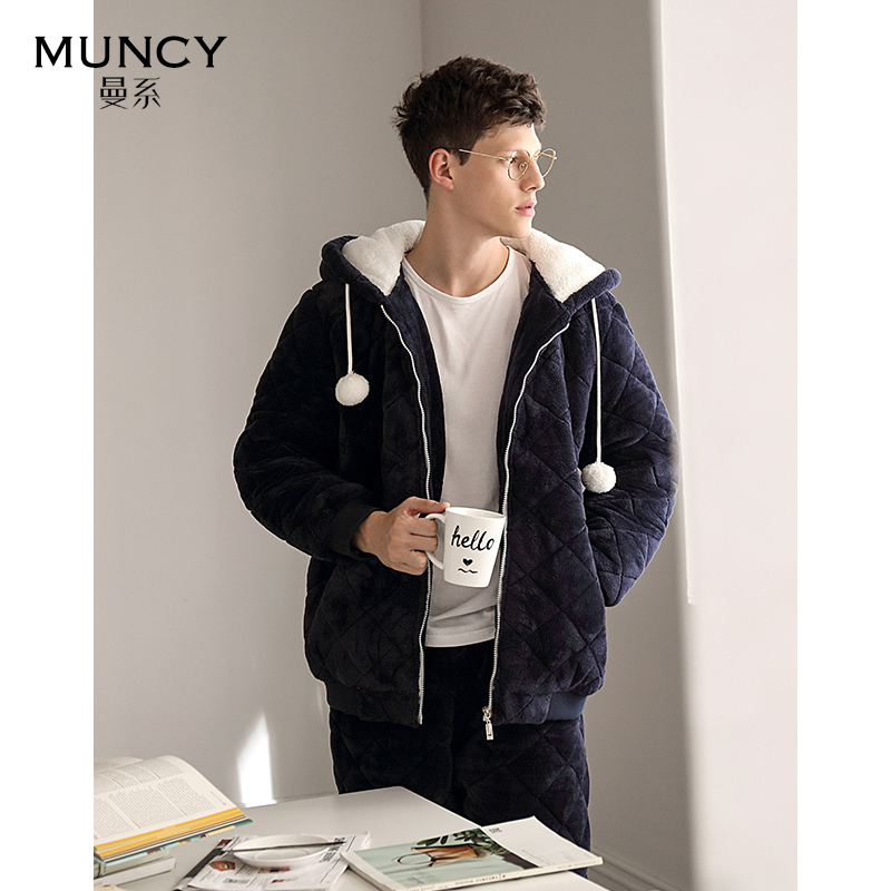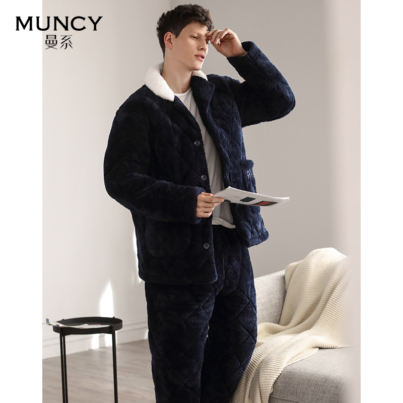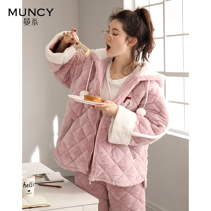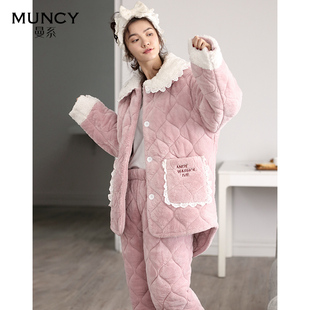 三层夹棉睡衣男女士秋冬珊瑚绒加厚棉袄保暖可外穿家居服情侣套装