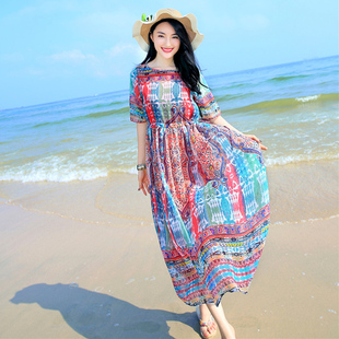 波西米亚新款 大摆夏雪纺显瘦海边度假沙滩裙连衣裙宽松长裙 大码