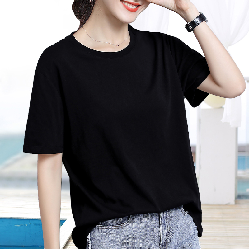 净版 黑色遮肚显瘦上衣纯棉纯色百搭基础款 体恤 宽松t恤女短袖 大码