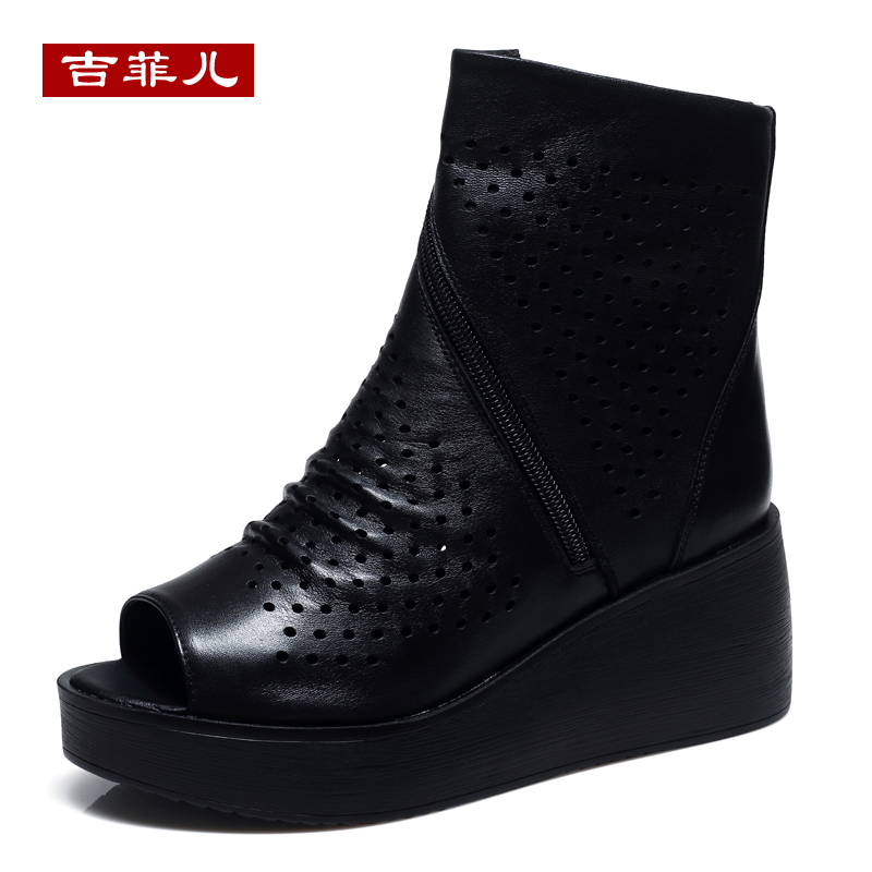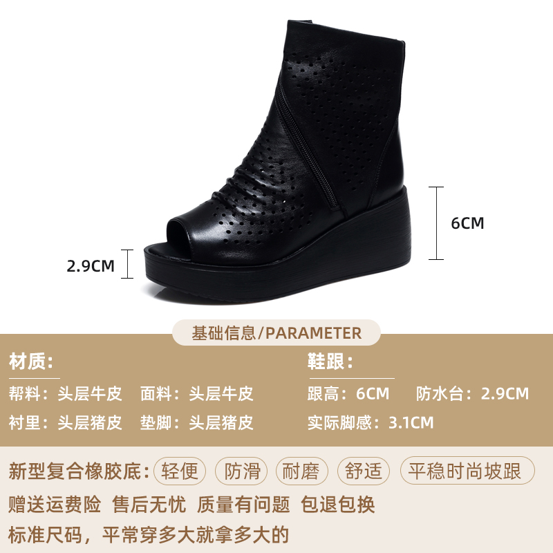坡跟靴子中跟短靴镂空真皮凉鞋 松糕鞋 鱼嘴凉靴秋季 高跟鞋 2025新款