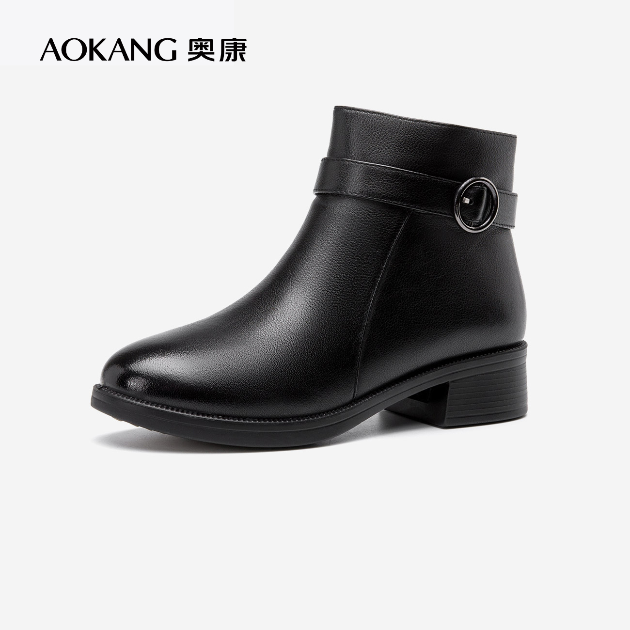 皮靴饰扣加绒保暖中老年粗跟短靴女 秋冬妈妈加厚棉鞋 奥康 女鞋