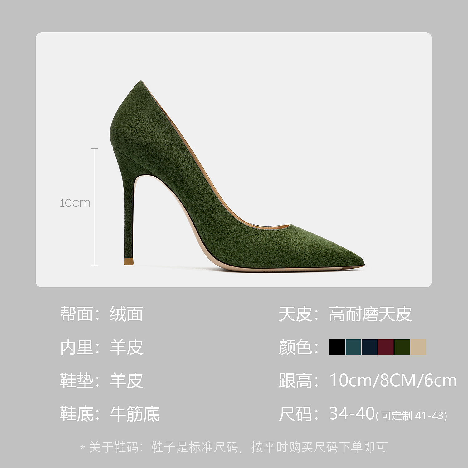 10cm 细跟性感气质百搭浅口绒面女士尖头单鞋 绿色高跟鞋 2025年新款