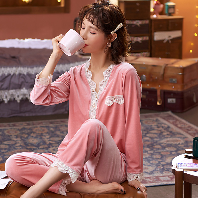春秋季 乐姿梦2025新款 睡衣女秋冬金丝绒公主风加厚加绒家居服套装