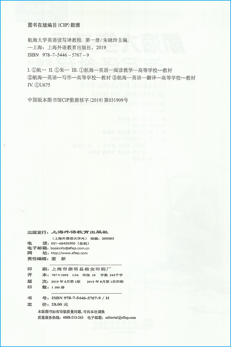 第一册 朱晓玲主编 专门用途英语 社 航海英语写作高等学校教材9787544657679 上海外语教育出版 航海大学英语读写译教程