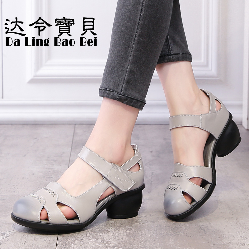 子 女夏中跟百搭魔术贴舒适粗跟女鞋 2025夏新款 真皮中跟包头凉鞋