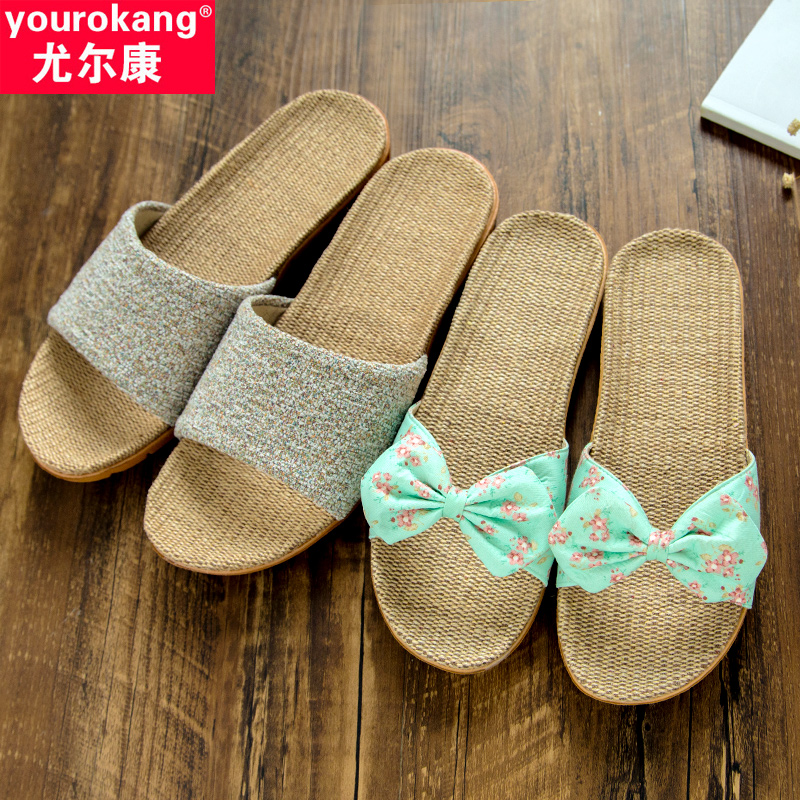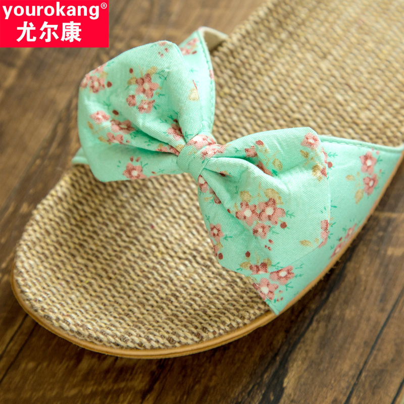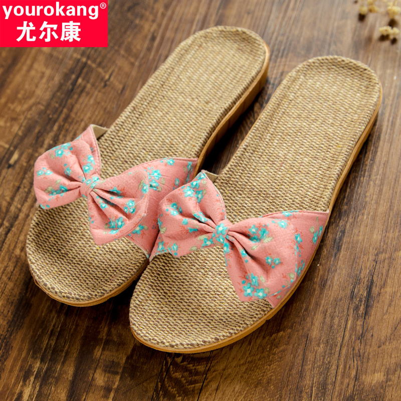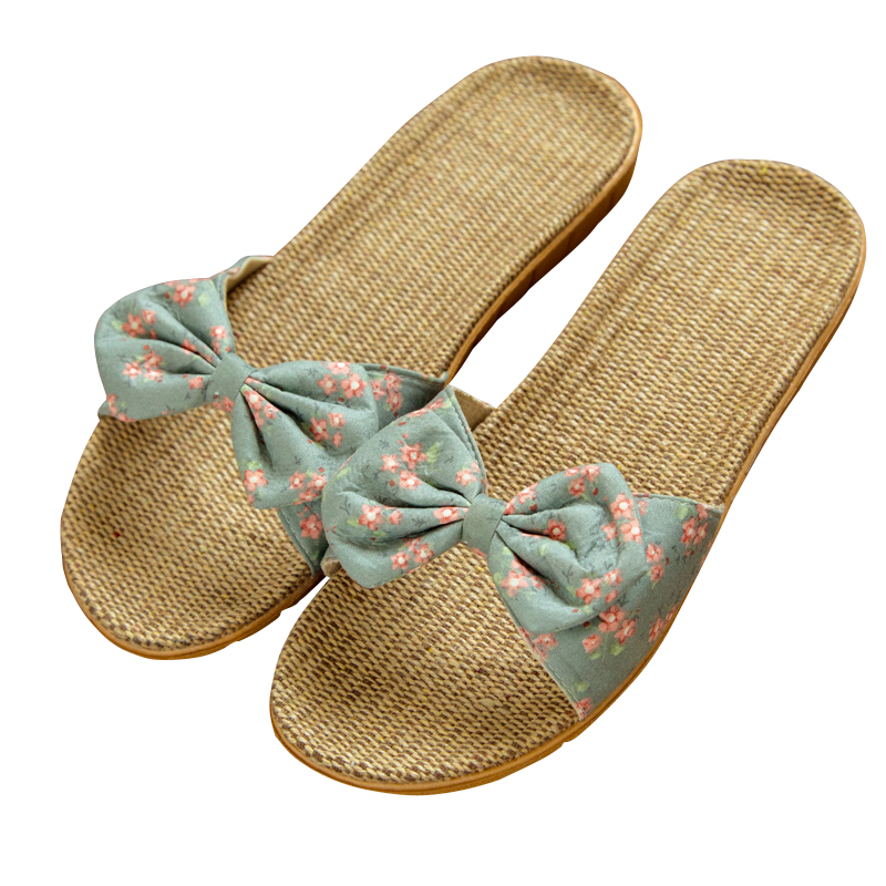 夏 家居室内家用情侣厚底防滑女士可爱蝴蝶结凉拖鞋 亚麻拖鞋 女夏季