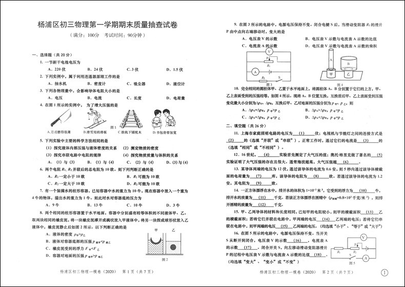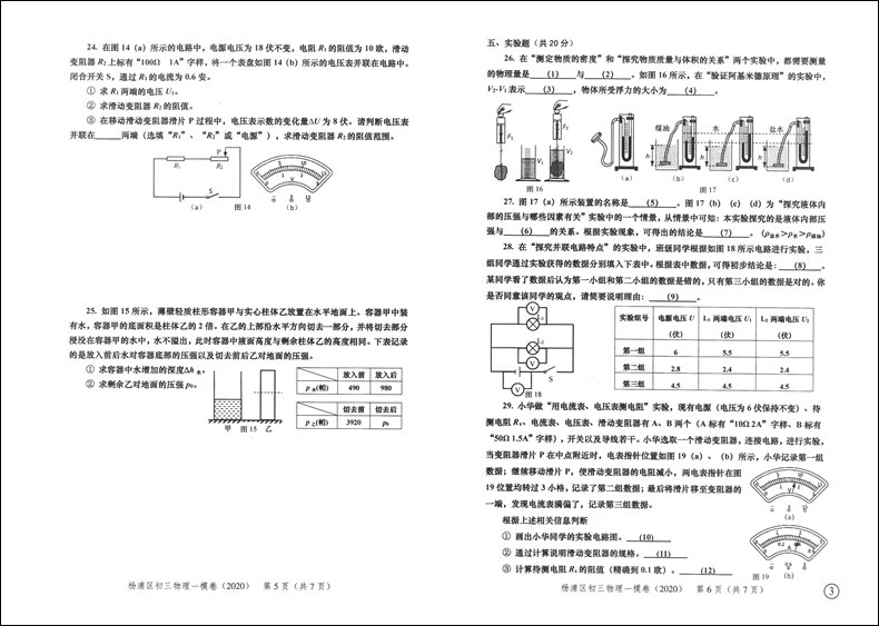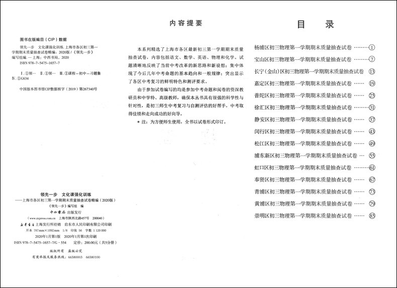 2020年版 领先一步文化课强化训练 物理一模卷 仅试卷 上海市各区初三初中第一学期期末质量抽查试卷模拟 上海中考一模卷物理 现货
