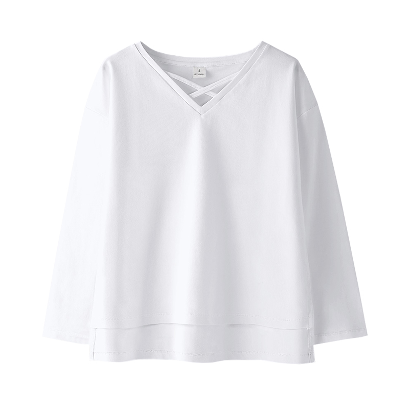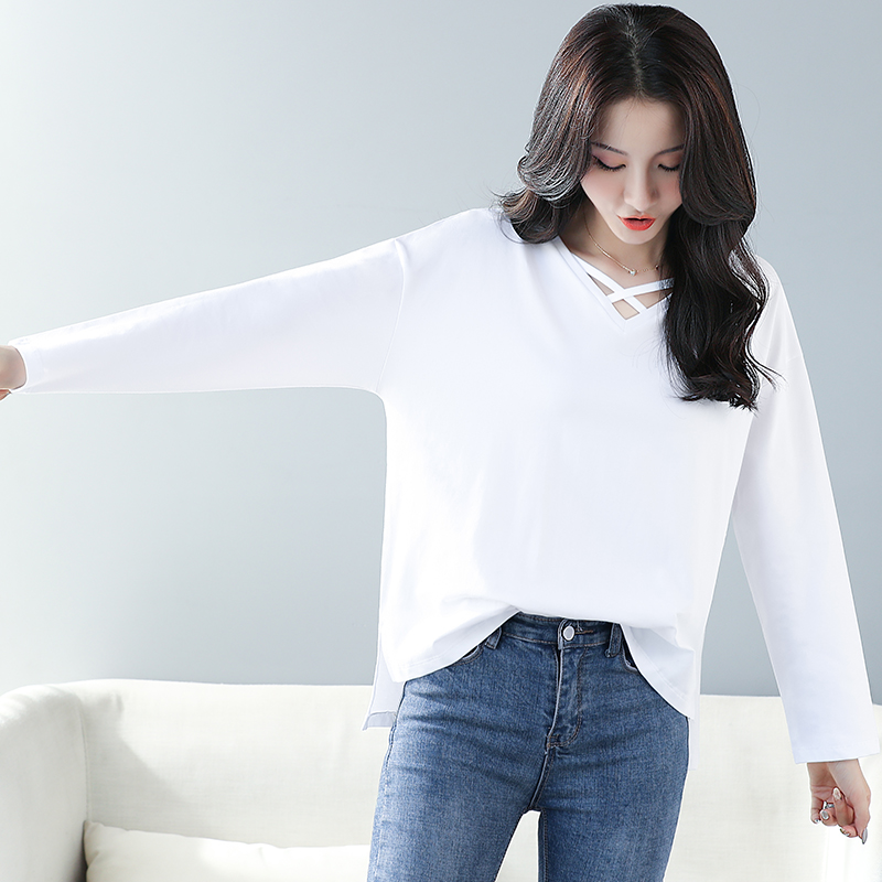 v领上衣女露锁骨不规则宽松大t恤长袖 白色性感洋气黑色显瘦打底衫