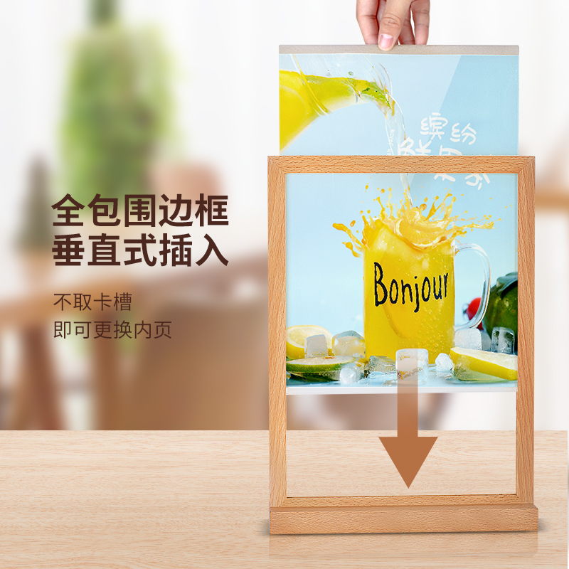 a4木质亚克力台卡架立牌双面实木展示架桌牌a5展示牌菜单台牌榉木台签餐桌点餐价目表a6价格牌桌面广告牌定制