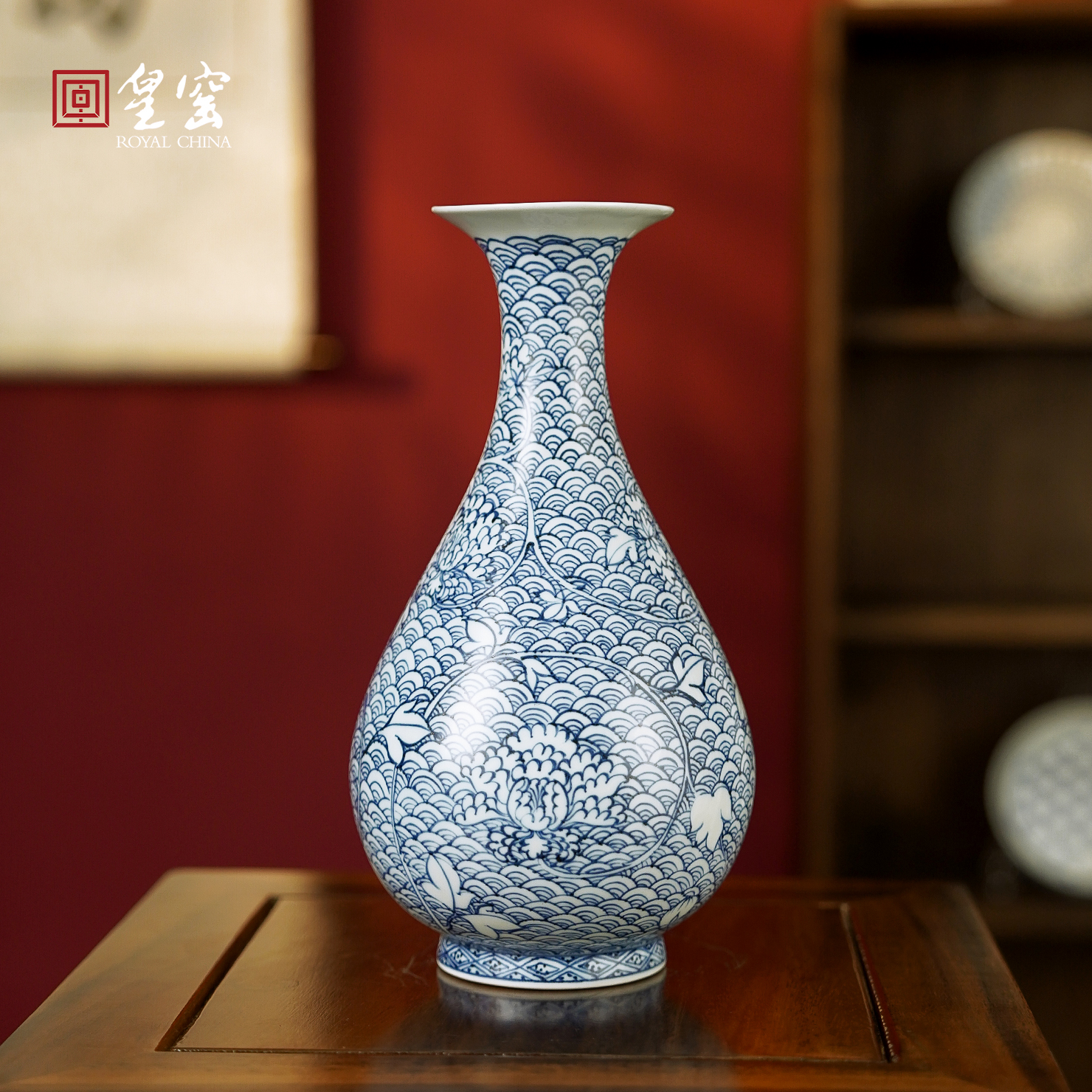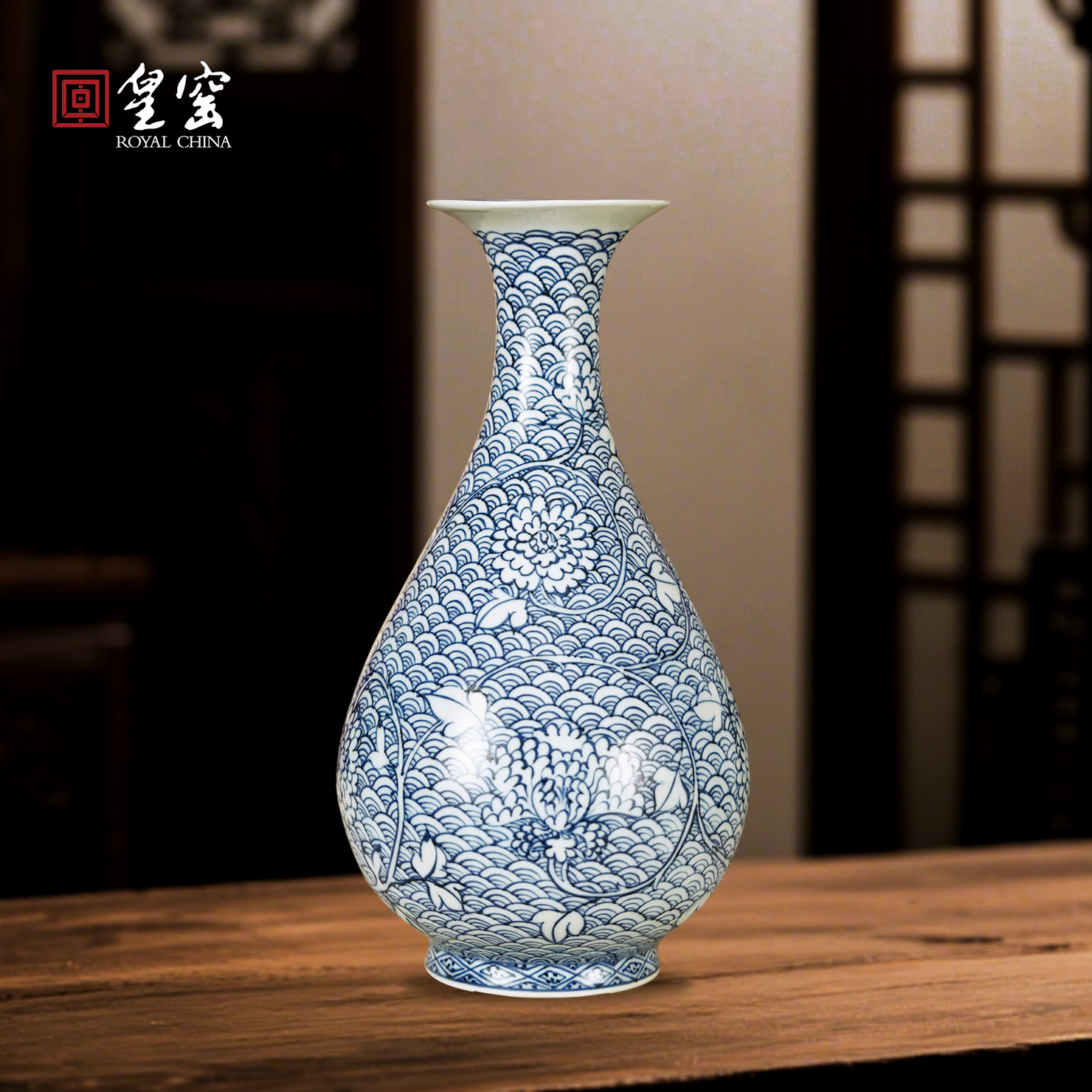皇窑花瓶景德镇陶瓷青花瓷海水牡丹纹玉壶春瓷瓶玄关客厅摆件摆件