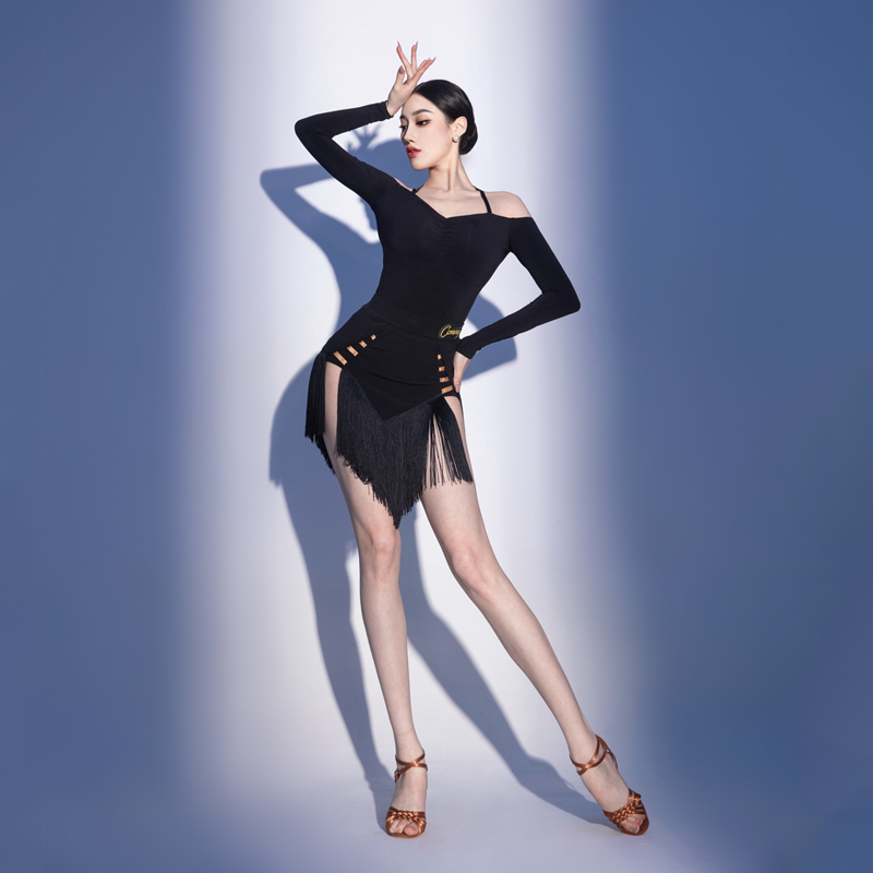 CONNY康尼拉丁舞蹈服装 连体上衣练功训练演出服 女流苏裙子长短袖