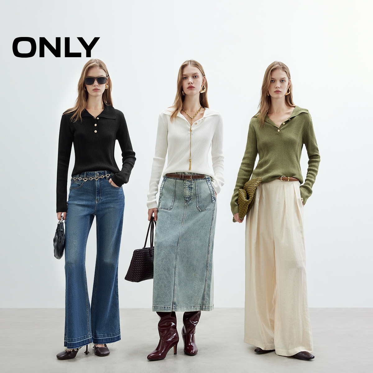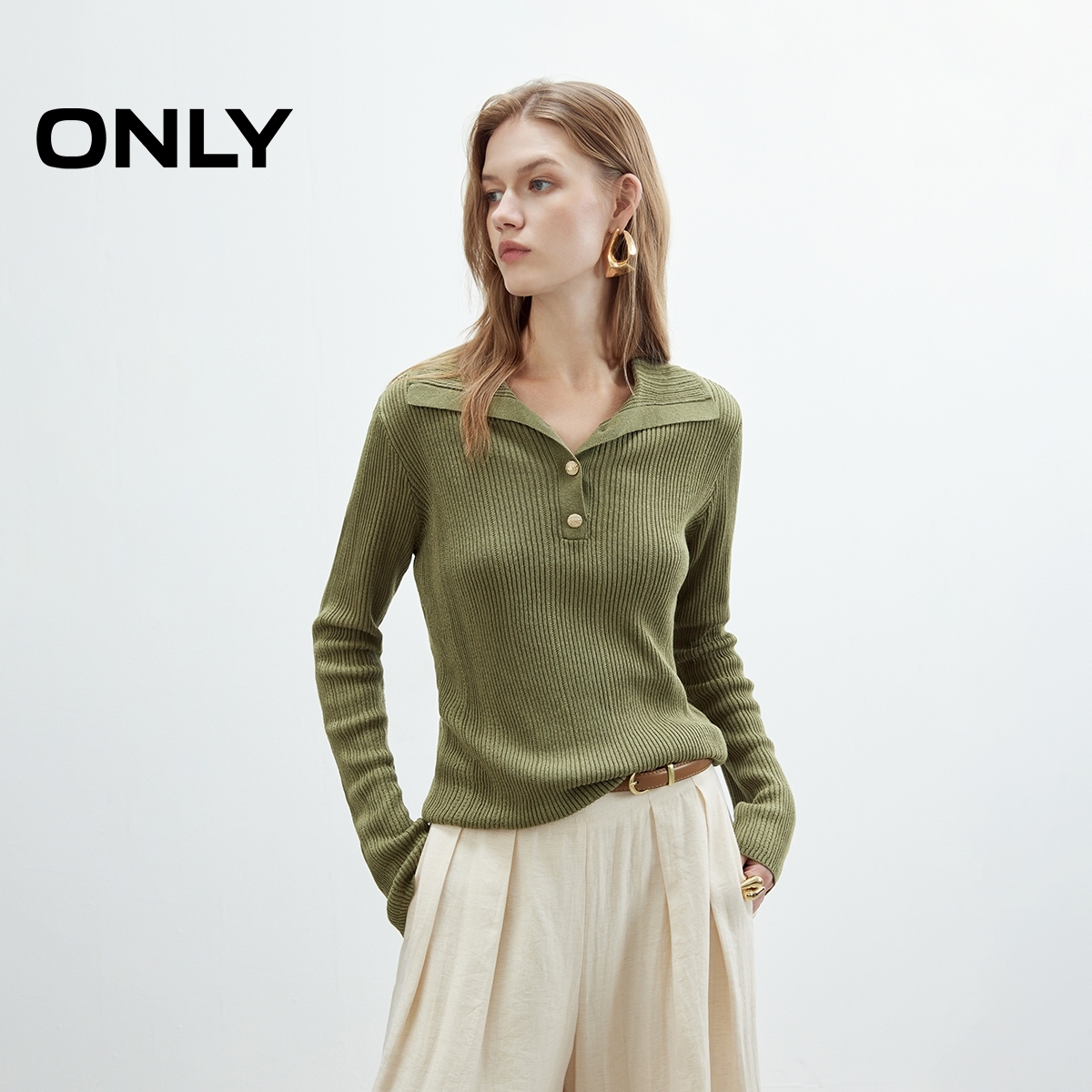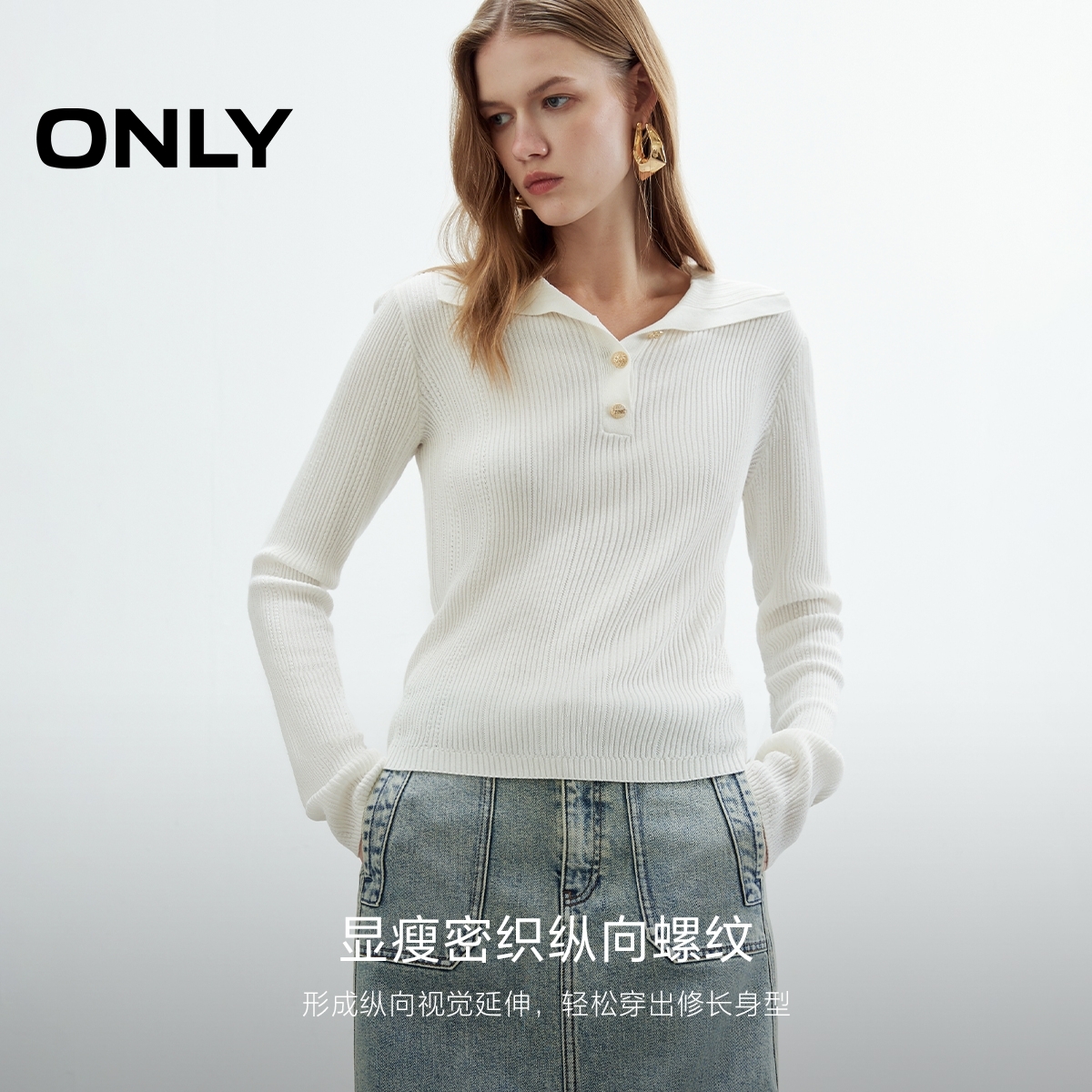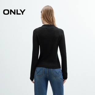 针织衫 ONLY2025秋季 微落肩纽扣纯色修身 高智感polo领长袖 女 新款