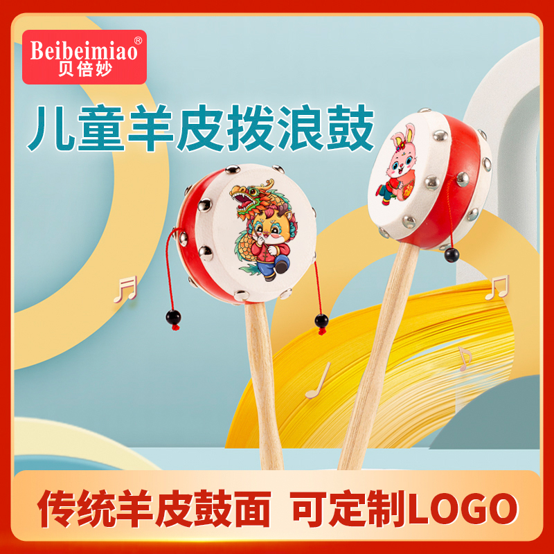 拨浪鼓早教新生婴儿传统拨浪鼓男孩女孩木质羊皮手摇鼓可定制图案