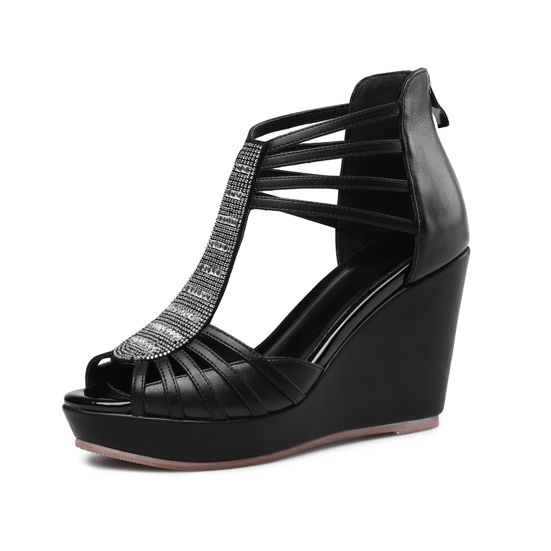 牛皮女鞋 坡跟厚底女士凉鞋 夏新款 后拉链镂空罗马鞋 真皮高跟鱼嘴鞋
