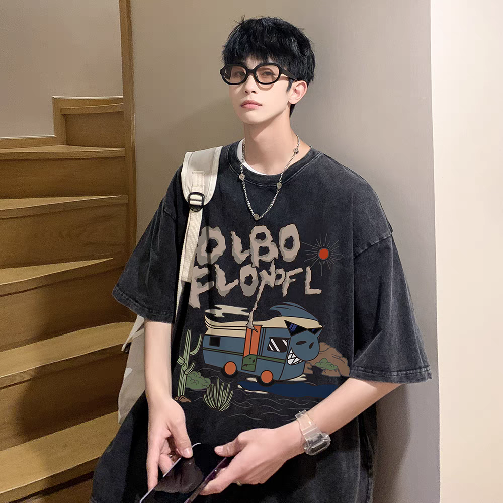 男装 t恤潮牌宽松情侣半截袖 复古水洗做旧短袖 美式 男夏季 300斤大码