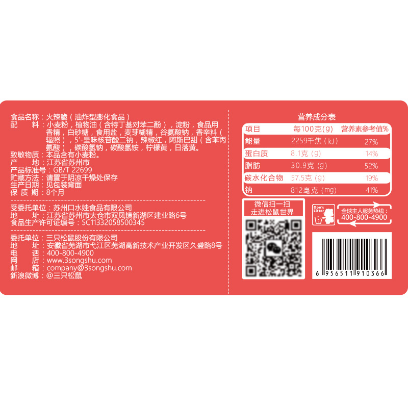 三只松鼠火辣脆105g虾条豆果解馋零食小吃 任选20件 专区99元