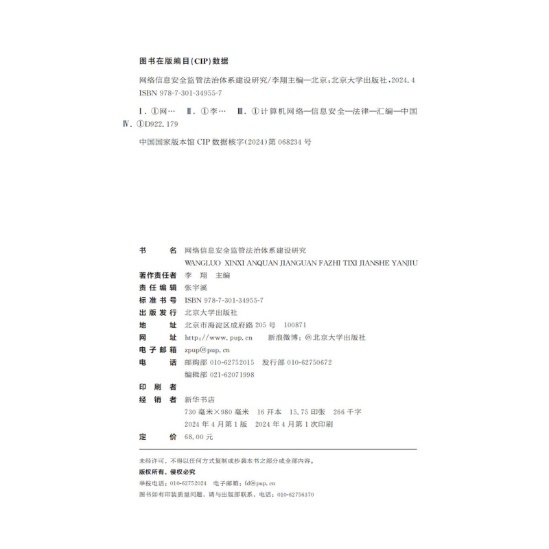 北京大学出版 正版 李翔 网络信息安全监管法治体系建设研究 社9787301349557 2024新书