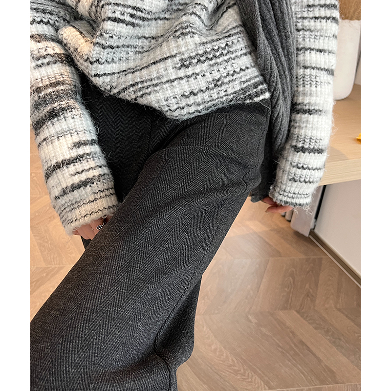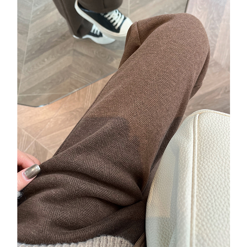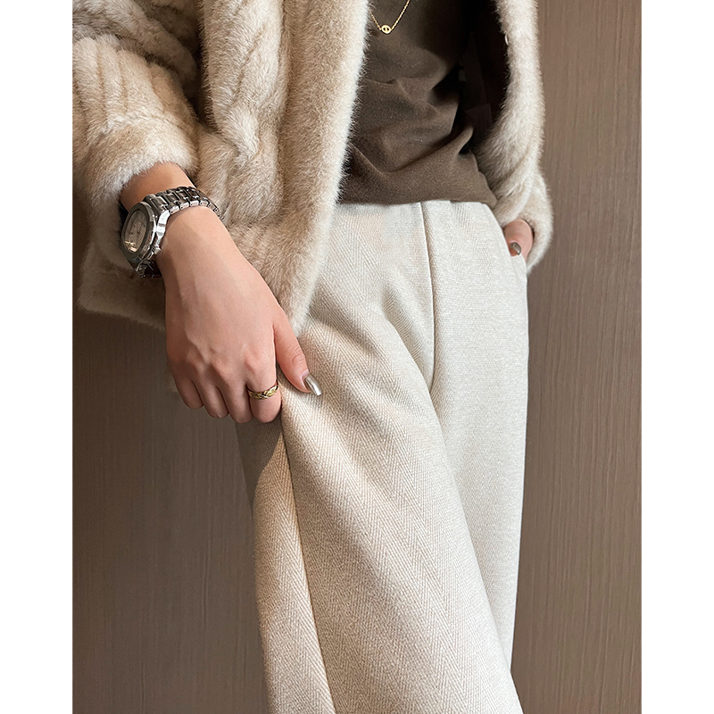 子 加绒裤 杏色毛呢阔腿裤 女秋冬加厚高腰直筒人字纹羊毛小个子窄版