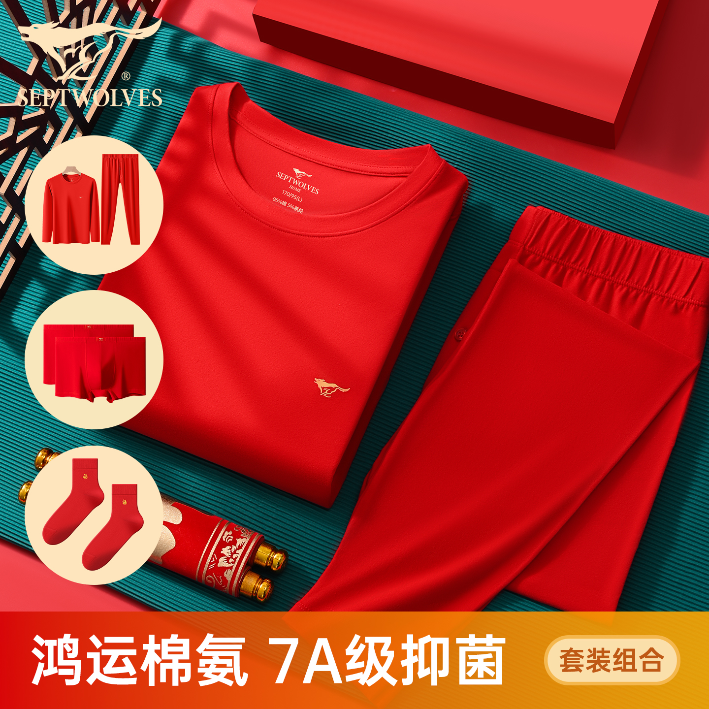 2025蛇年结婚红色衣服 纯棉秋衣秋裤 七匹狼本命年保暖内衣套装 男士