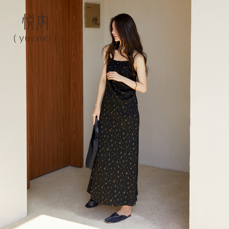 悦内带胸垫睡裙女款 夏天纯棉吊带背心碎花裙子黑色高级感 睡衣夏季