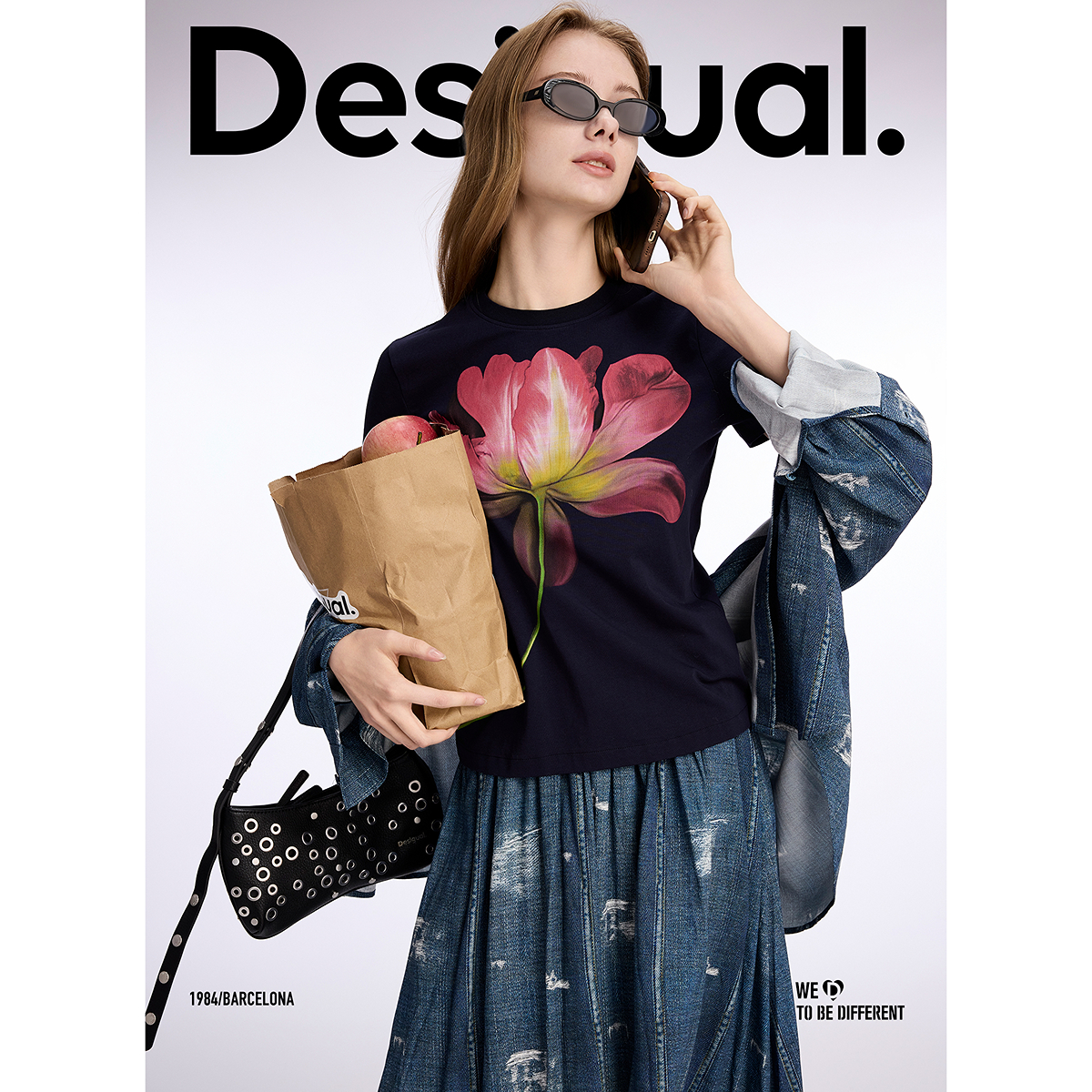 女士T恤 型弹力圆领短袖 Desigual花朵印花修身 显瘦版