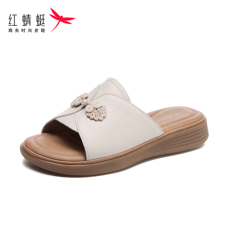 真皮妈妈 外穿夏凉拖鞋 红蜻蜓女士一脚蹬厚底一字拖拖鞋 女2025新款
