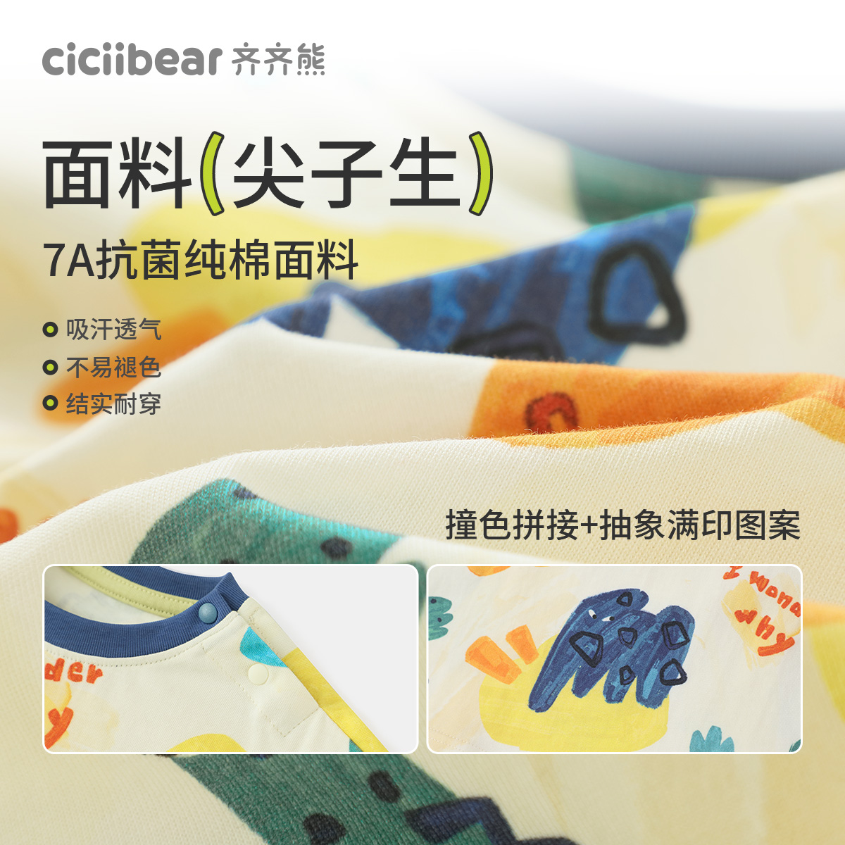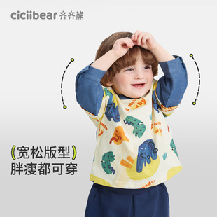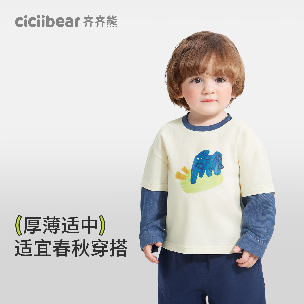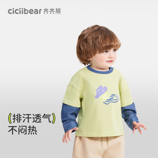 t恤春秋款 齐齐熊宝宝长袖 假两件男童圆领印花上衣女 7A抗菌纯棉