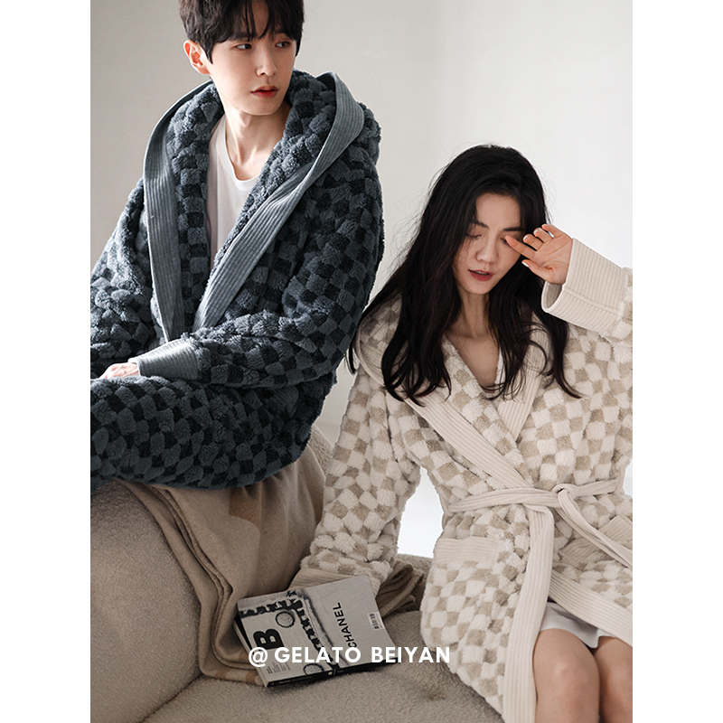 保暖家居服 睡袍棋盘格男士 贝妍珊瑚绒情侣睡衣秋冬季 女性感中长款