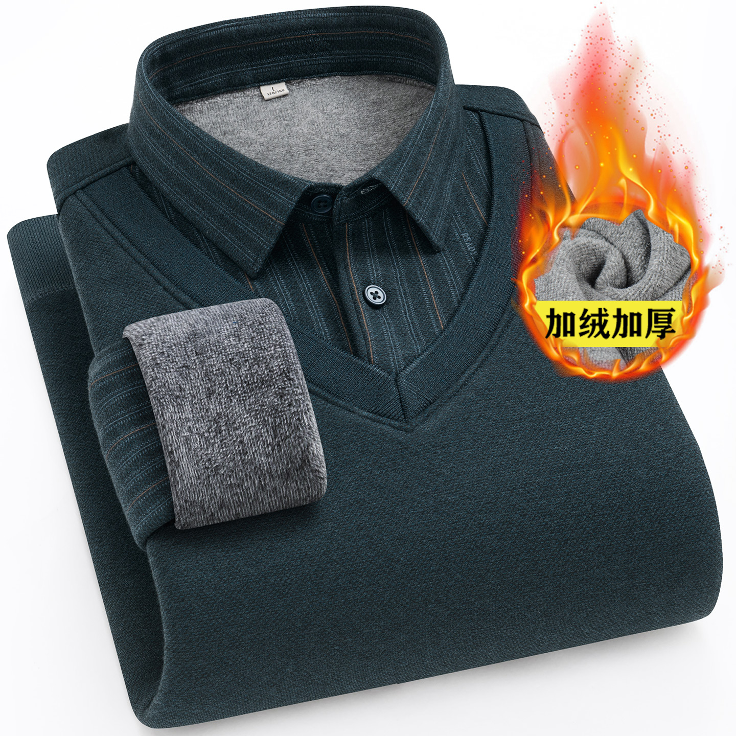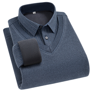 休闲外穿上衣 领假两件针织打底衫 男士 保暖内衣中青年加绒加厚衬衫